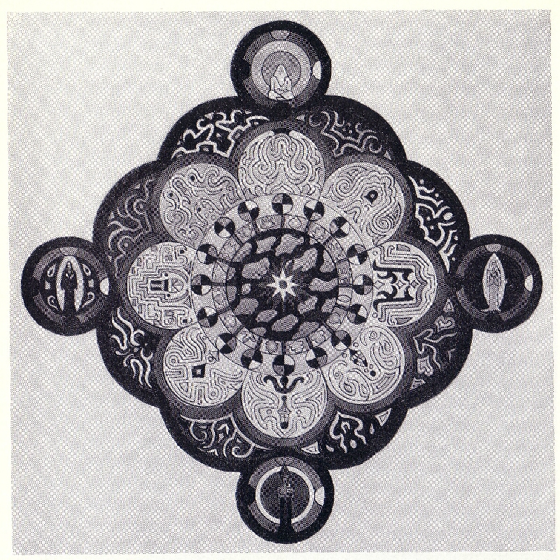 派因为卫礼贤的宗教背景而对他充满疑忌,宗教界则对他传教时的越界行为而心有余悸。可是,荣格认识到了卫氏工作的巨大意义,尤其是其《易经》翻译。在他看来,卫礼贤译成德语的中国智慧,对于西方人来说有着莫大的孕育力。一方面,是荣格帮助卫礼贤在德语学术界赢得了严肃性和应有的地位,并为他以为最重要的两部卫氏译著作序或撰文:《易经》(英译本,1950)和《金华秘旨》。另一方面,这两本书对荣格本人产生了深远的影响。 其实,东西方的融合,在某种程度上也是二者的角力。这种角力在1910年甚至体现于卫氏身体:他因中国食物而患上阿米巴痢疾,卧床数月之久。一年后,他遇见了曾任京师大学堂总监督兼署学部副大臣的劳乃宣,并在这位智者的帮助下克服了内心的中西对抗,至少在一个时期内不再烦乱。不幸的是,卫礼贤1924年彻底返回德国以后,安宁也随之而去,欧洲和中国元素之间的角力又在他体内复发。当初的阿米巴痢疾,后来被证明为致命的。长期潜伏的病菌,让他无法抵御在中国染上的疾病,于1930年夺去了他的生命,享年仅57岁。[14]荣格说:“我只是在卫礼贤生命的最后岁月才同他接触的。我能观察到,随着其毕生事业的完成,欧洲和欧洲人如何又一步步向他靠近,甚至困扰着他。[……]他的梦里充满了对中国的回忆,但他看到的画面总是悲哀阴郁的。这清楚地表明,中国内涵已经走向反面。”[15] 如荣格所看到的那样,卫礼贤终究没有能力在自己身上融合东西两种元素。虽然他被中国精神所浸染,但在根子上并未失去其欧洲认同,也没有能力在心理上重新回到欧洲生活中去。荣格曾试图对他进行治疗,但是他内心的东西方冲突过于猛烈。当他再次被西方拥抱和同化时,出现了东西方精神之间的抵触,甚至对自己传播东方文化的事业不再忠诚了。[16]另一方面,尽管他没能完全在自己的心灵中实现两种文化的综合,但是他的著述,尤其是他的译作《易经》,无疑成功地实现了二者的融合。对于许多西方人来说,《易经》与《金华秘旨》无疑是其接近和理解独特的东方文化和精神世界的极佳途径,并作为卫礼贤的精神遗产而长存。 荣格在 我这次在巴特瑙海姆心理医疗大会上所作报告的成果是,[21]心理医疗协会理事会决定——我事先并不知道——诚邀您在明年的会上(或许在巴登—巴登)作一个报告。这是历史性的!您想一下,那些直接接触常人及其身上最虚弱部位的医生,能给他们接种中国哲学之疫苗,这意味着什么?!这简直难以估量。我感到很兴奋,只是希望魔鬼不要阻拦您的这次历史作为。这才叫击中要害。医学着实在向心理层面转化,这里得有东方的介入才行。那些神学家和哲学家是什么也办不成的,他们太傲慢。[22] 卫礼贤接受讲演邀请之后,荣格在 二、荣格布“道”:《金华秘旨》,曼荼罗,炼丹术 我已经记不清那个时候究竟画过多少曼荼罗,反正很多。我在这么做的时候,一直疑虑重重:“我的努力通向何方?目的是什么?”[……]多年以后,也就是在1927年,一个梦证实了我对中心和本我的看法,我用一张曼荼罗展示了这个梦的要义,称之为“通向永恒的窗户”。[……]一年以后我又画了一张画,也是曼荼罗,中间是一座金色的宫殿。画完之后我问自己:“这幅画为什么有中国味?”打动我的是图案和色调,我觉得它们很有中国味;尽管外观上与中国无关,但它给我这种感觉。就在这以后不久,卫礼贤寄函给我,真是一个奇异的巧合。他寄给我一本中国道家炼丹术书稿请我写评论,书名是《金华秘旨》。我急不可待地念完了书稿。这部文献出乎意料地印证了我关于曼荼罗和环流的思考。这件事第一次冲破了我的孤独。我感到有了知音,我可以在那里找到连接点。为了纪念这次巧遇,这种“同时性”,我当时在这幅曼荼罗下面写下如下文字:“1928年,当我画这幅坚固的金色宫殿时,身居法兰克福的卫礼贤给我寄来了千年之久的中国文本,讲述的是座黄色宫殿,即不朽之躯的胚胎”。[25] 荣格所言“第一次冲破了我的孤独”,实为肺腑之言。他与弗洛伊德“分道扬镳”之后,弗氏同仁对他的学说颇多诋毁,使他在心理分析学圈内长期处于孤立无援的境地。《金华秘旨》岂止是“知音”和“连接点”,而是强有力的援军,加上《易经》之理论基础的莫大增援。 荣格、卫礼贤编《金华秘旨》初版环扉和扉页 《金华秘旨》初版中的曼荼罗图样之一 荣格在很多地方提到上文中第一幅曼荼罗“通向永恒的窗户”,例如在《论曼荼罗象征》(Über Mandalasymbolik,1938, 1950)一书中。他之所以要详尽地讲述曼荼罗对于他的意义,在于他把绘制曼荼罗看做自我分析的一部分,认为自己发现了“本我”(Selbst)及其表现形式。[26]这一发现起始于1918-1919年间:他随意在一个小本子里画些环形画,试图以此捕捉自己所处的精神状态。日复一日,他观察着自己的心理变化和无名意绪,感到自己逐渐在这些画中发现了某种“中心”。他断定那不只是他的“自我”(Ich),而有着更深层、更广博的层面,他称之为“本我”或“整体”(Ganzheit)。他用这些概念来表达一种体验,即在意识和我中心之外,还有人格(Persönlichkeit)中心,这一人格既包含意识,也包含无意识。 对荣格来说,卫礼贤寄给他的《金华秘旨》译稿,无疑是一个出乎意料的馈赠,给他展示出一条认识意义的路径,也就是他大约摸索了10年之久,在绘制
