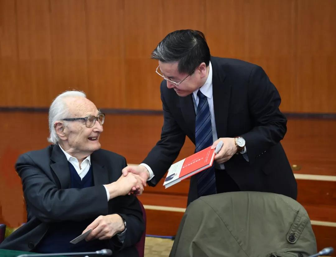 校领导和国际处领导赠送新著《中国教给我们什么》。 汪德迈先生向校领导赠送新著《中国教给我们什么》 颁奖仪式之后,米歇尔·冉刻教授与汪德迈教授联袂发表《人文科学方法论》的学术讲演,以郑重致谢。 (本期摄影:齐松/图文编辑:王文超)